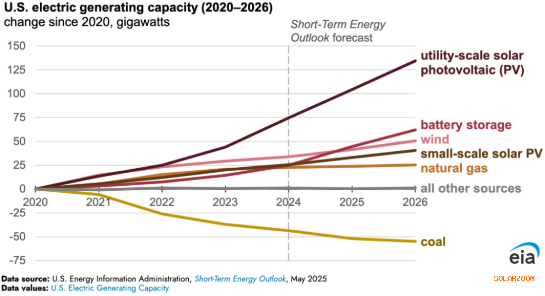 但根据该《短期能源展望》,美国燃煤发电厂运营商表示,他们计划在2025年退役约5%的发电能力,其中大部分将在今年年底完成。EIA预计2026 年煤炭发电量将下降9%(610 亿千瓦时)。