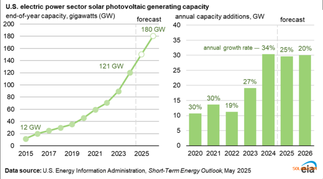 同时,EIA预计2025年和2026年的年度新增太阳能装机容量将与2024年新增的31吉瓦装机容量持平。