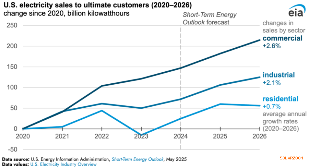 EIA预测,2025年居民用电销量将增至1,5250亿千瓦时,商业用电销量将增至1,4690亿千瓦时,工业用电销量将增至1,0650亿千瓦时,均创历史新高。