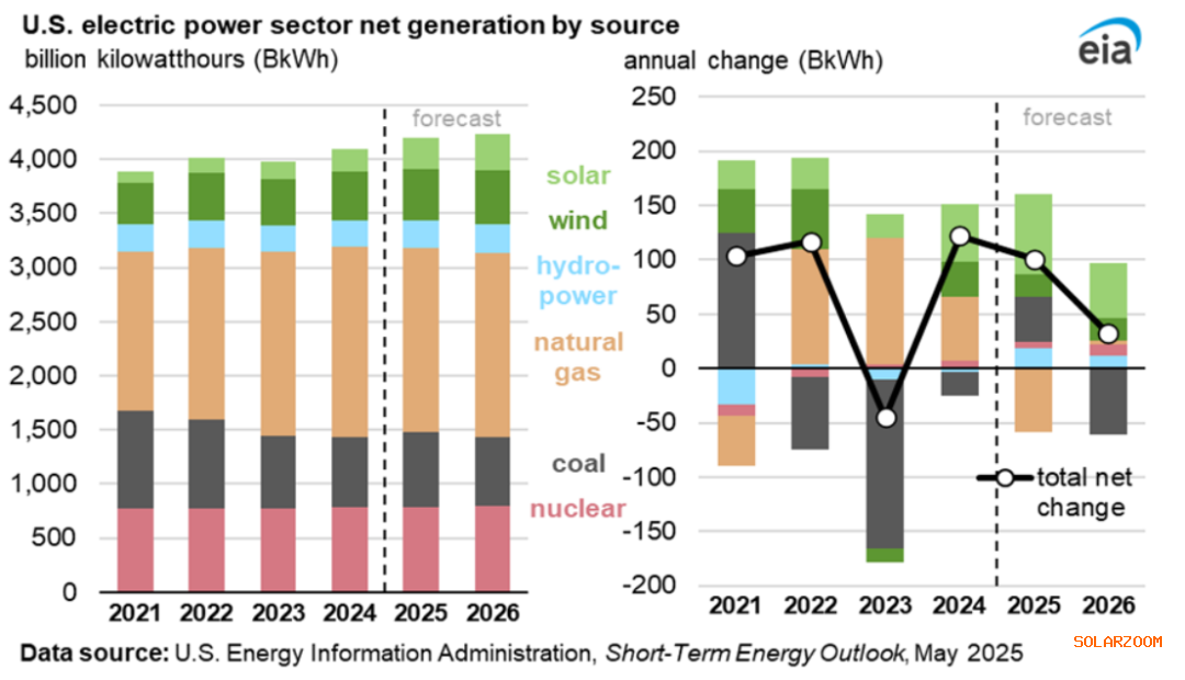 太阳能发电方面,美国发电量的最大增长来自公用事业规模的太阳能发电厂。据EIA预测,2025 年美国太阳能发电量将增长34%(740 亿千瓦时),2026年将增长18%(520 亿千瓦时)。太阳能发电厂发电量的增加也同时限制了天然气发电量的增长。