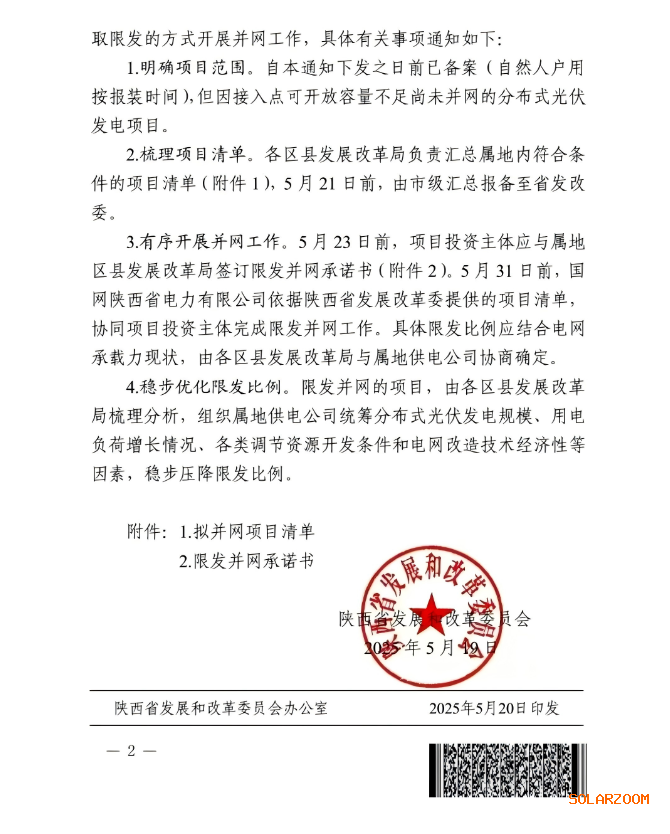 5月31日前,国网陕西省电力有限公司协同项目投资主体完成限发并网工作。