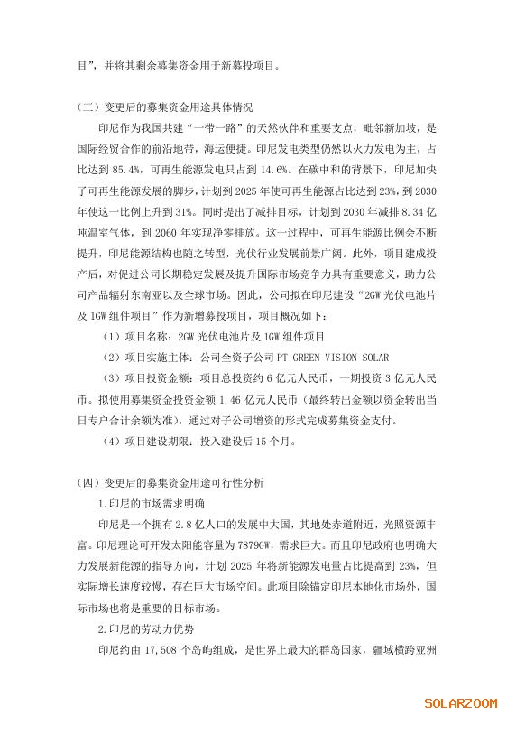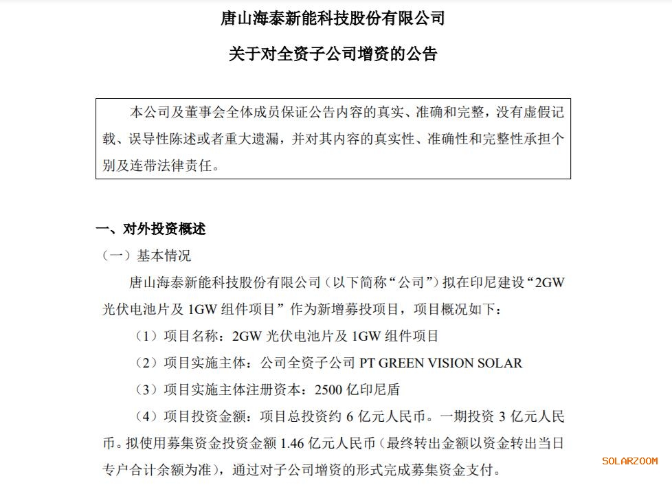 在终止国内项目的同时,海泰新能将目光投向了海外市场。同日发布的《关于对全资子公司增资的公告》显示,公司拟在印尼建设“2GW光伏电池片及1GW组件项目”作为新增募投项目。