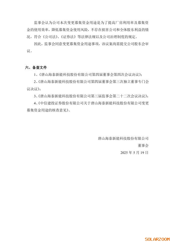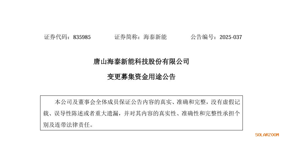 5月19日,海泰新能发布公告称,终止10GW TOPCon电池项目和研发试验中心扩建项目,同时发布对全资子公司增资公告,将募集资金变更用于印尼3GW电池组件项目。