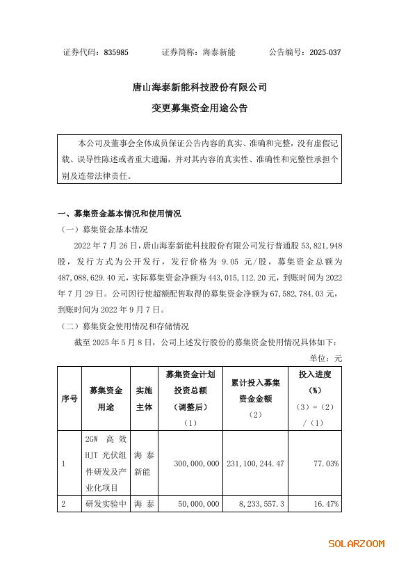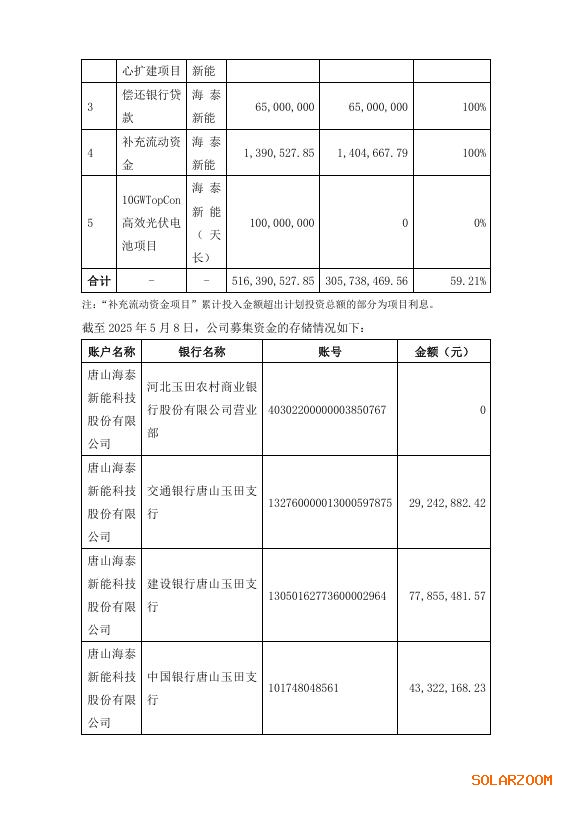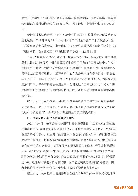 根据《海泰新能变更募集资金用途公告》,公司决定终止使用募集资金投入“研发实验中心扩建项目”及“10GW TOPCon高效光伏电池项目”,并将剩余募集资金转向新项目。从项目进展来看,截至5月8日,研发实验中心扩建项目投入进度为16.47%,累计投入募集资金金额823.36万元;10GW TOPCon高效光伏电池项目尚无实质性进展。