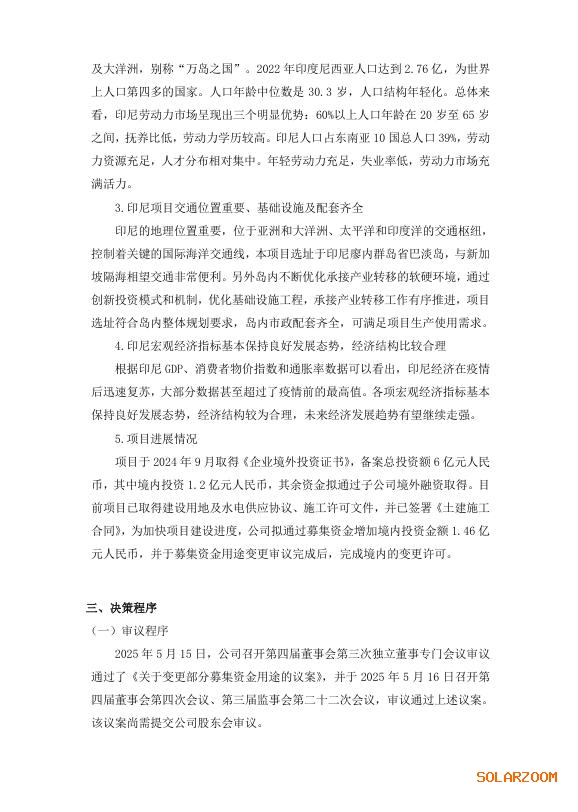 该项目总投资约6亿元人民币,其中一期投资3亿元人民币。公司拟使用募集资金投资金额1.46亿元人民币,通过对子公司增资的形式完成募集资金支付。目前,该项目已取得《企业境外投资证书》、建设用地及水电供应协议、施工许可文件,并已签署《土建施工合同》。项目建设期限为投入建设后15个月,由海泰新能全资子公司PT GREEN VISION SOLAR负责实施。