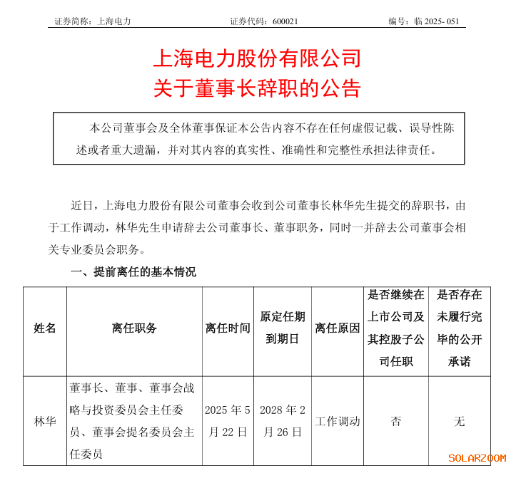 5月23日,上海电力发布公告,公司董事长林华由于工作调动,申请辞去公司董事长、董事职务,同时一并辞去公司董事会相关专业委员会职务。
