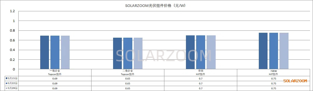 本周前半周组件市场情况:国内5.31抢装也已经临近尾声,下月国内组件订单进一步萎缩,国内需求较为惨淡,国内组件价格短期仍将承压,同时订单不足的情况下,国内组件企业排产预计也将出现进一步下调。而临近月末市场上头部几家组件企业计划通过继续减产来维稳甚至上涨组件价格,部分龙头企业已试探性报涨组件价格,本周市场上组件价格落在0.65-0.70元/W区间,但中小组件企业的价格波动较为混乱,而最终组件价格上涨能否被下游接受,还需端午节后情况而看。具体能否顺利上涨仍视节后情况而看。海外方面,目前海外市场巴基斯坦、巴西、中东等地区光伏组件需求表现较为抢眼,但要弥补国内下滑的需求仍有难度。