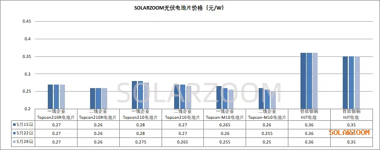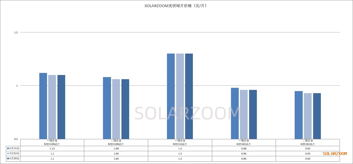 本周国内硅片价格底部维稳,暂未继续下跌,市场实际成交较为有限。当前下游终端需求下滑明显,下游电池厂商自身的排产也存在不确定,对硅片的采购也是放缓观望,目前硅片价格在现有成本压力下已无下跌空间。本周N型M10L硅片价格在0.93-0.95元/片区间波动,210R硅片价格落在在1.05-1.1元/片区间,N型210硅片价格在1.28-1.3元/片区间,各尺寸硅片逐步接近区间价格的低位。排产方面,6月在即下游需求暂未看到有起色迹象,库存压力未有明显缓和,而硅片价格几无下跌空间下,市场上硅片企业减产力度不排除将进一步增大,6月硅片整体排产预计仍将继续下滑,但幅度仍有待各家硅片实际情况而定。HJT硅片方面,近期HJT硅片价格也是随着N型其他硅片价格的下跌而下跌,本周HJT半片价格来至0.615-0.625元/片区间,下游HJT电池排产有限,对应HJT硅片的需求订单也较为有限。
