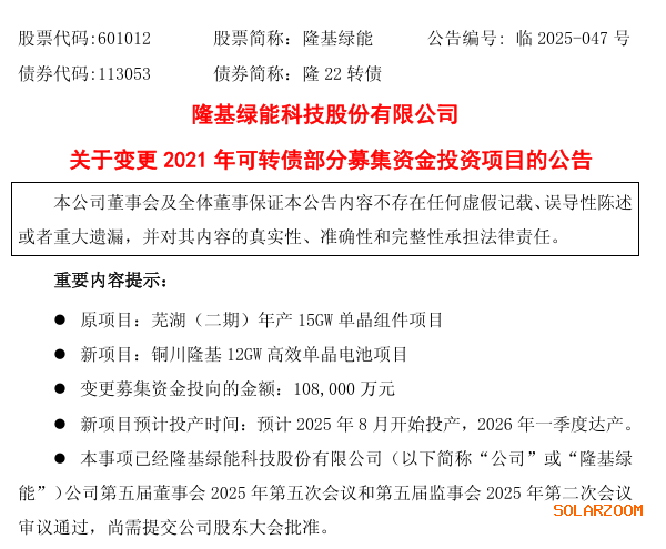5月27日,隆基绿能(601012.SH)发布公告,为提高募集资金使用效率,加快公司BC电池先进产能建设,根据战略规划和经营需要,公司拟终止芜湖(二期)年产15GW单晶组件项目投入,并将原计划投入芜湖(二期)年产15GW单晶组件项目建设的募集资金10.8亿元,变更用于投资建设铜川隆基12GW高效单晶电池项目。