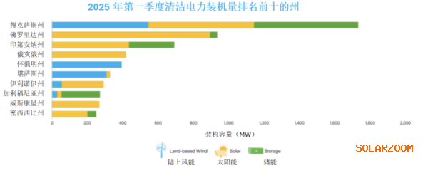本季度新增4.4 GW太阳能装机容量比创纪录的2024年同期减少了30%。佛罗里达州在2025年第一季度装机量中名列前茅,新增894 MW,略高于本季度新增电网级太阳能装机总量的20%。