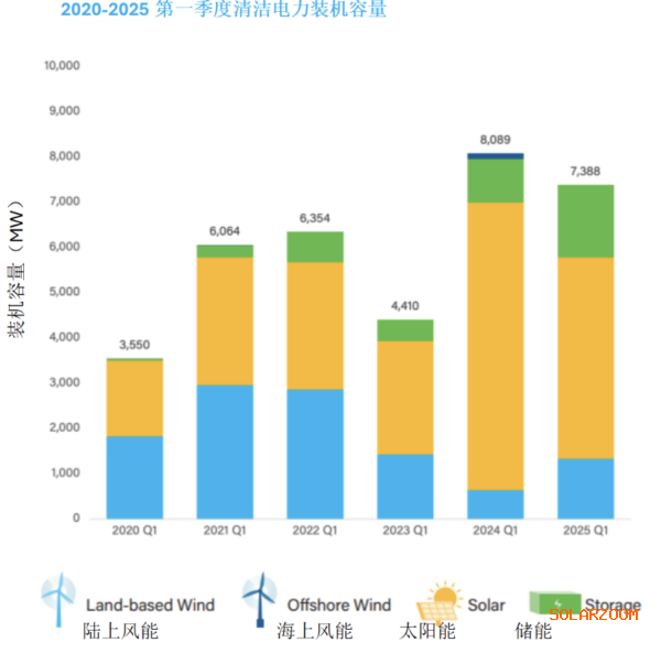 根据ACP最新报告,2025年第一季度美国公用事业级太阳能、风能和储能的装机量为7.4 GW,仅次于2024年第一季度创纪录的8.1 GW。