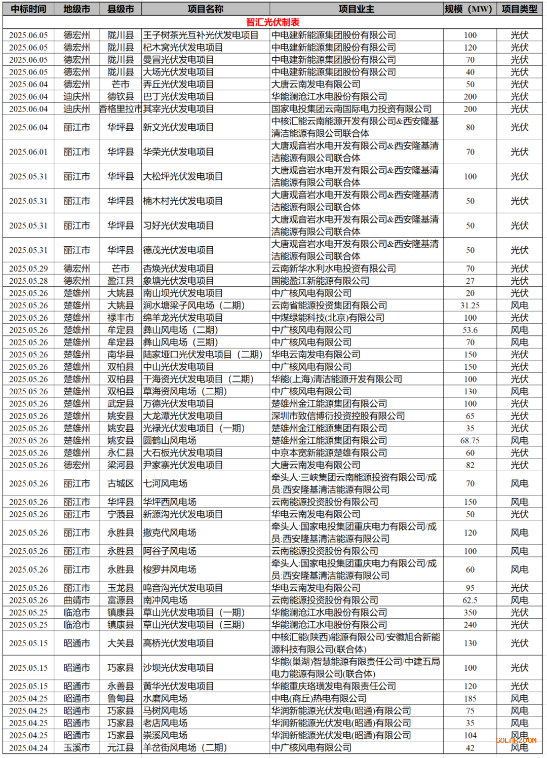 (云南2025年第一批的全部名单参考《云南:下发14.5GW新能源项目》)