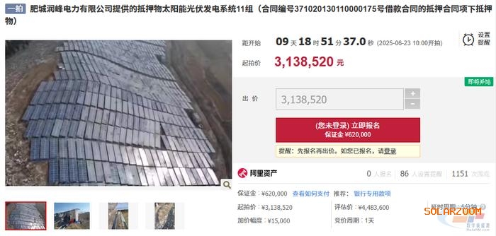 记者从资产交易拍卖平台获悉,山东省济南市中级人民法院将于2025年6月23日10时在拍卖平台进行司法拍卖,拍卖标的为被执行人肥城润峰电力有限公司提供的抵押物太阳能光伏发电系统11组。