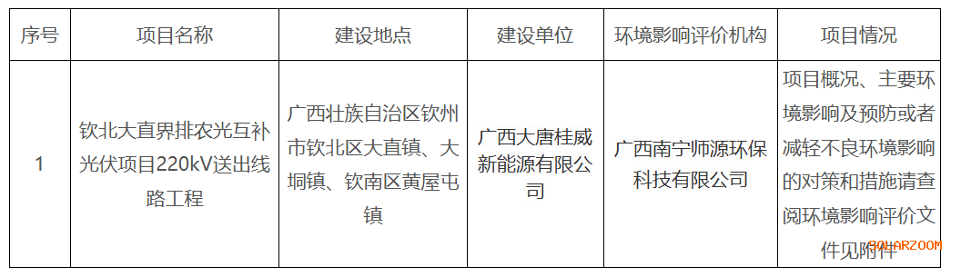 我局于2025年6月16日受理了《钦北大直界排农光互补光伏项目220kV送出线路工程环境影响报告表》,经审查,拟作出同意审批意见。根据《中华人民共和国环境影响评价法》《中华人民共和国行政许可法》《环境影响评价公众参与办法》(部令 第4号)等有关规定,现予以公示,欢迎公众参与建设项目环境保护工作。
