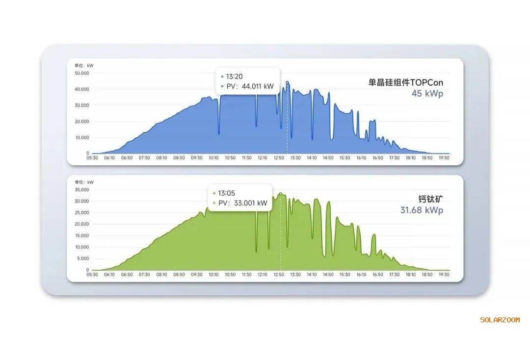 2025年06月10日为相对日照比较好的一天,发现单晶硅最大功率为44.011kW,达到TOPCon的本身装机容量的97.80%;钙钛矿最大功率为33.001kW,功率达到装机容量的104.17%(比同样单晶硅单kW多发6.37%),系统效率长期达到100%的运行,打破常规光伏组件的运行思路。