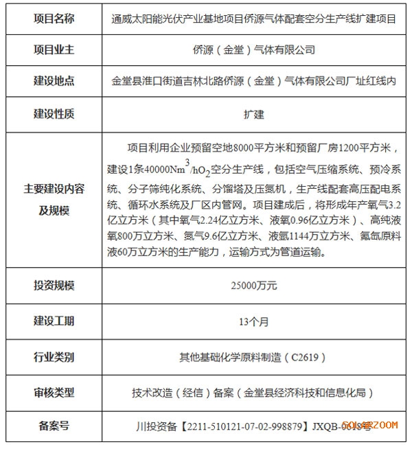 附件:侨源(金堂)气体有限公司通威太阳能光伏产业基地项目侨源气体配套空分生产线扩建项目基本概况表