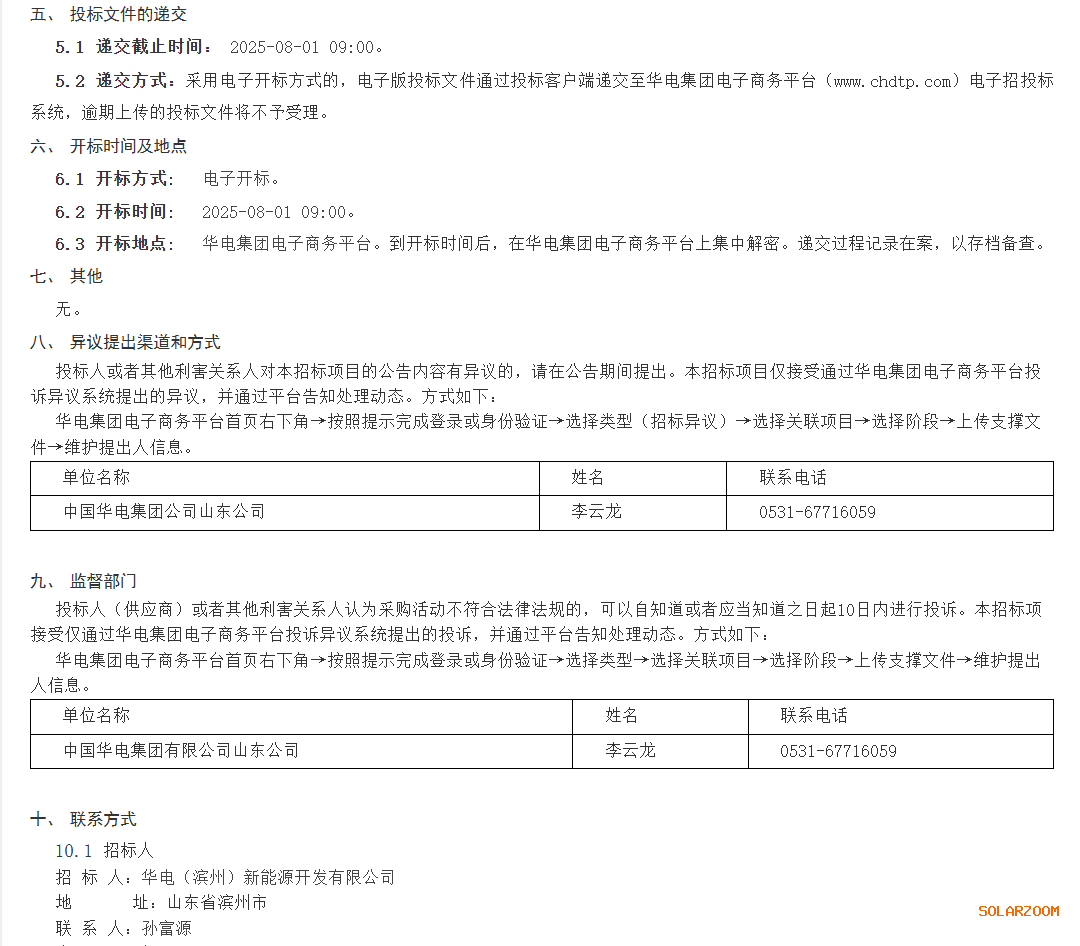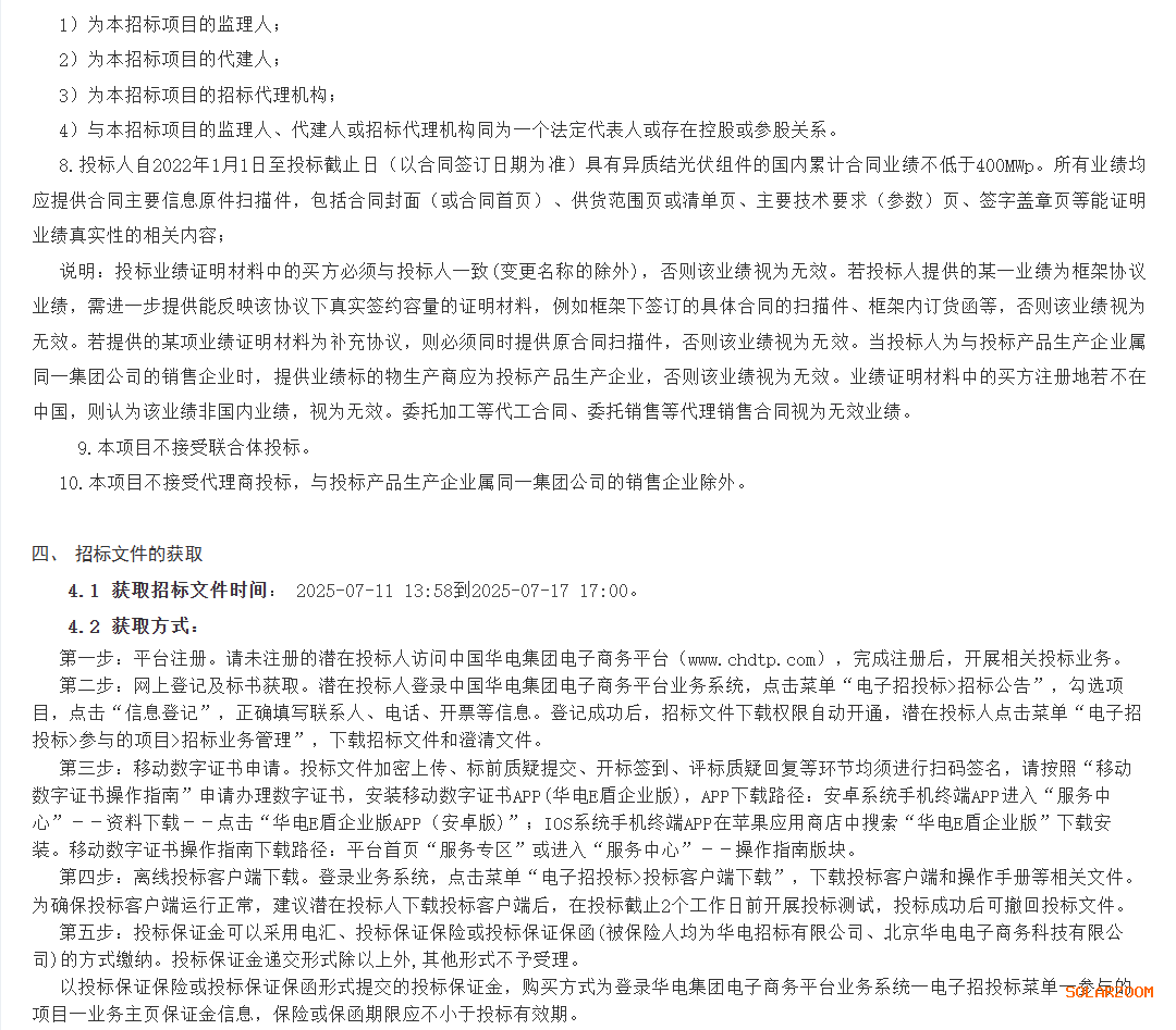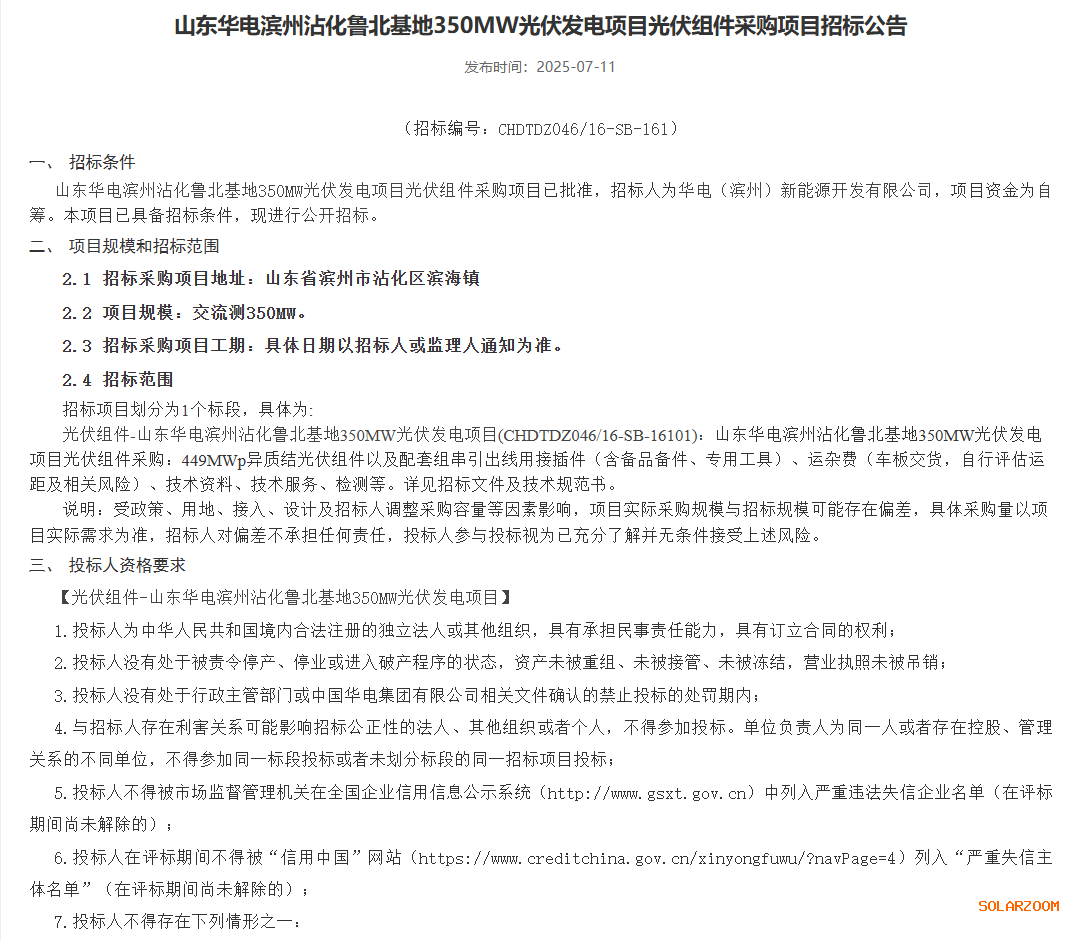 7月11日华电电子商务平台发布了《山东华电滨州沾化鲁北基地350MW光伏发电项目光伏组件采购项目招标公告》,招标项目划分为 1 个标段,具体为 :
