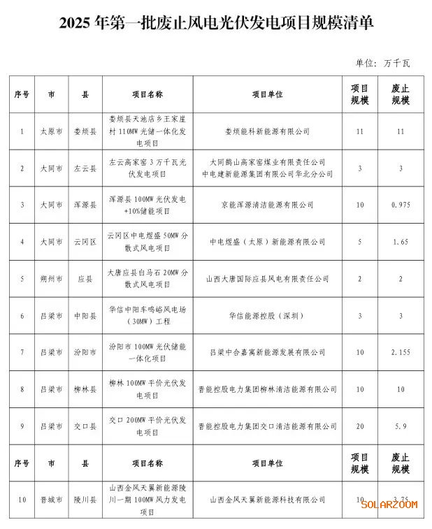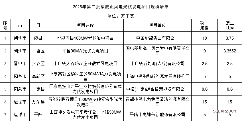 7月14日,山西省能源局公示2025年第二批拟废止风电光伏发电项目规模的清单。