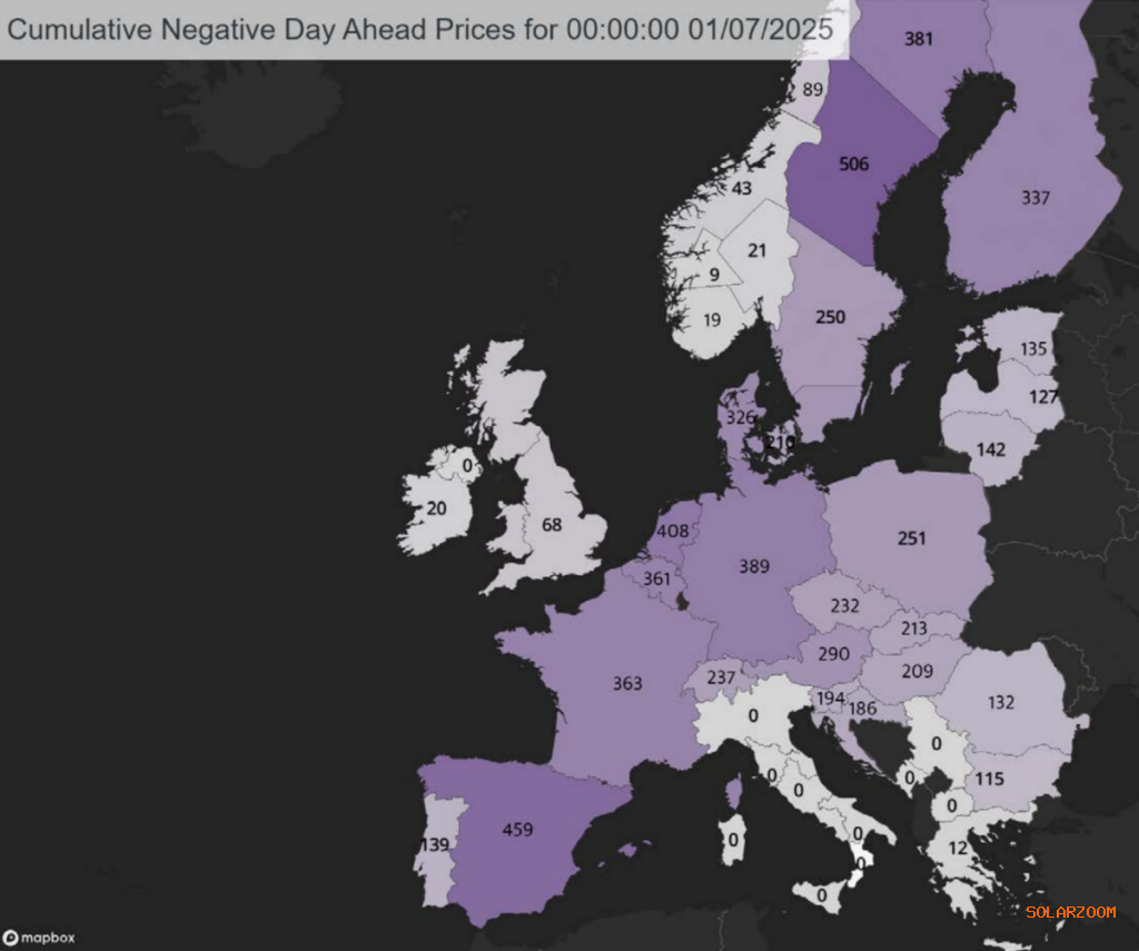 该机构在其2025年第二季度欧洲电力市场总结报告中指出,今年几乎所有欧洲国家的负电价时段均显著增加,且未来这一趋势仍将持续。