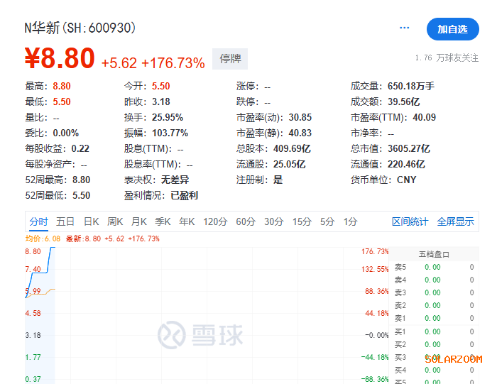 7月16日,华电新能主板上市首日迎来暴涨,开盘6分钟上涨124.84%触发一次临停,复牌后仅仅2分钟再次上涨至176.73%触发二次临停,总市值也飙升至3600亿!