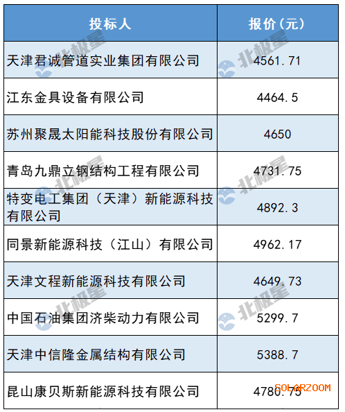 根据公示,10家企业中标,包括天津君诚管道实业集团有限公司、江东金具设备有限公司、苏州聚晟太阳能科技股份有限公司、青岛九鼎立钢结构工程有限公司、特变电工集团(天津)新能源科技有限公司、同景新能源科技(江山)有限公司、中国石油集团济柴动力有限公司等。