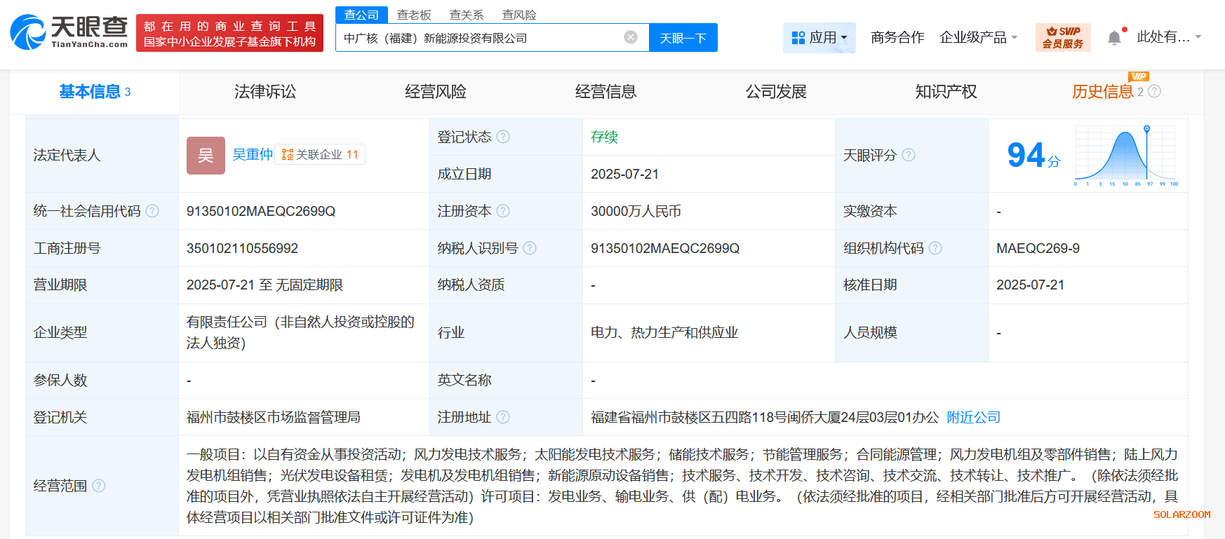 天眼查App显示,近日,中广核(福建)新能源投资有限公司成立,法定代表人为吴重仲,注册资本3亿人民币,经营范围含以自有资金从事投资活动、风力发电技术服务、太阳能发电技术服务、储能技术服务、节能管理服务、陆上风力发电机组销售等。股东信息显示,该公司由中广核风电有限公司全资持股。