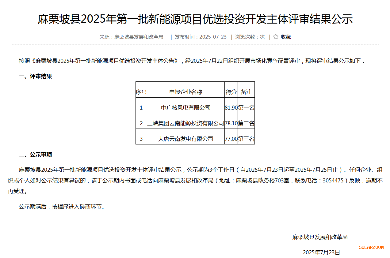 记者获悉,7月23日,云南省文山州麻栗坡县2025年第一批新能源项目优选投资开发主体评审结果公示。