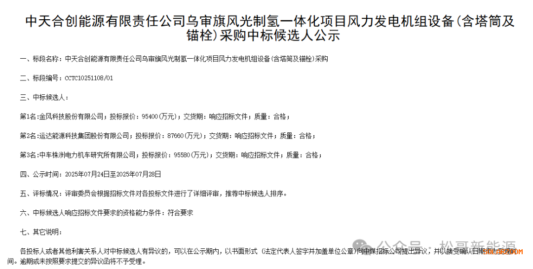 7月24日,中煤招标平台发布《中天合创能源有限责任公司乌审旗风光制氢一体化项目风力发电机组设备(含塔筒及锚栓)采购》中标候选人公示,总规模容量:450MW。