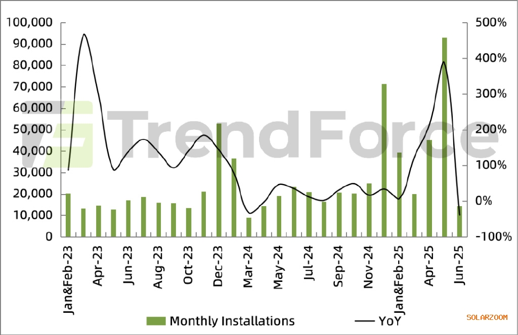 根据测算,2025年6月中国新增光伏装机规模为14.38GW,同比下降38.4%,环比下降84.6%。
