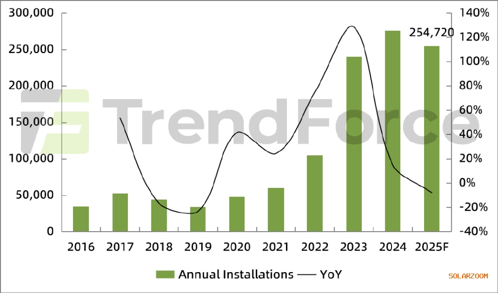 TrendForce集邦咨询分析师认为,随着2024年的装机数据达到历史新高后,2025年光伏装机增速将进一步放缓,预计2025年中国光伏新增装机将达255GWdc左右,同比或出现下降趋势。