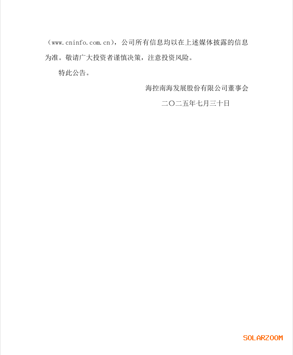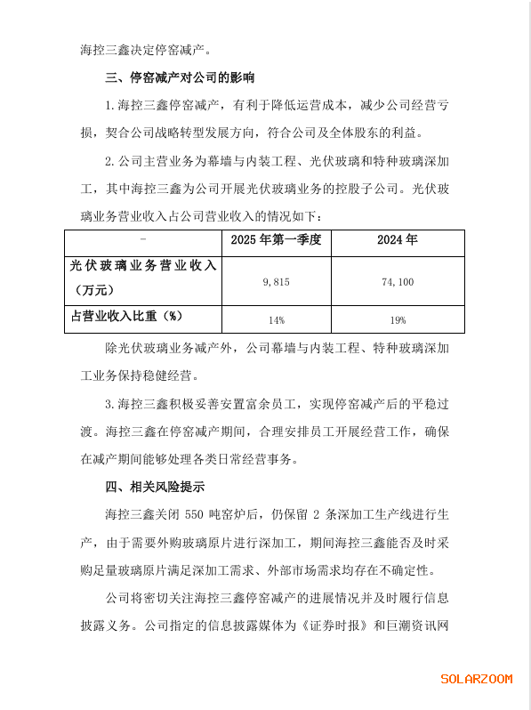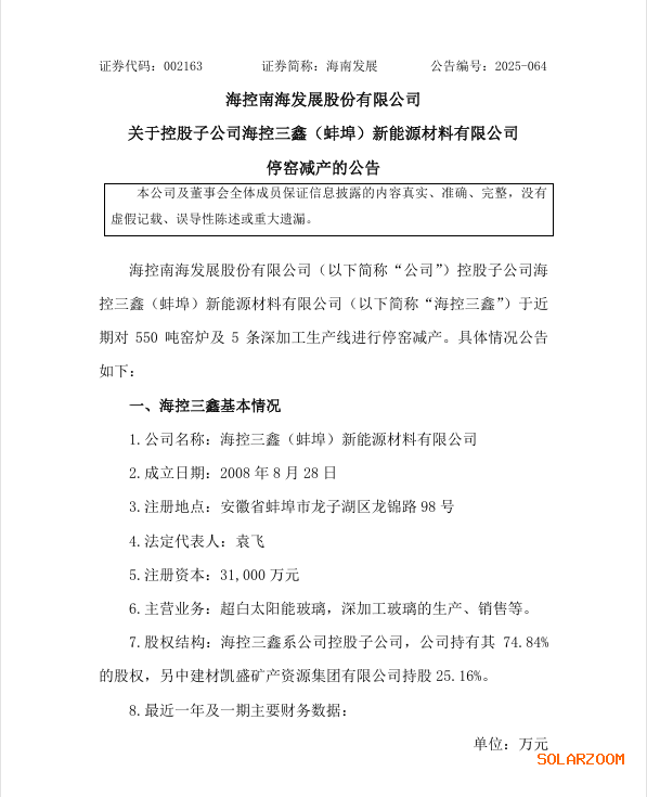 7月29日海南发展(002163.SZ)公告称,公司控股子公司海控三鑫于近期对550吨窑炉及5条深加工生产线进行停窑减产。公司主营业务为幕墙与内装工程、光伏玻璃和特种玻璃深加工,其中海控三鑫为公司开展光伏玻璃业务的控股子公司。海控三鑫关闭550吨窑炉后,仍保留2条深加工生产线进行生产,由于需要外购玻璃原片进行深加工,期间海控三鑫能否及时采购足量玻璃原片满足深加工需求、外部市场需求均存在不确定性。