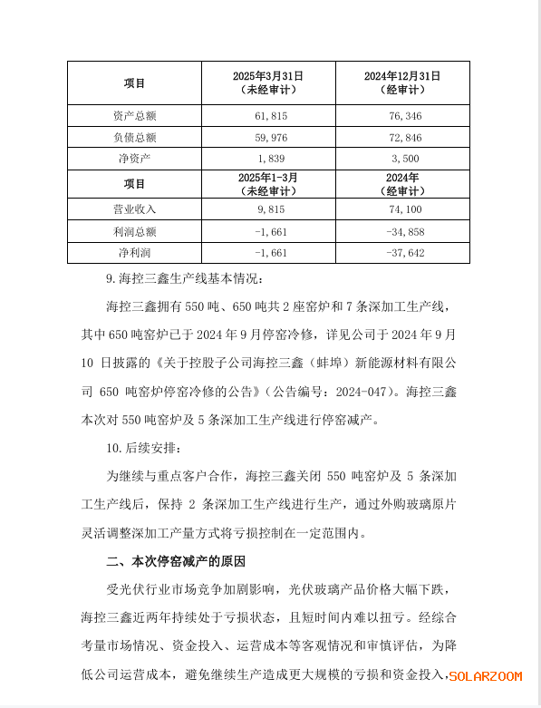 受光伏行业市场竞争加剧影响,光伏玻璃产品价格大幅下跌,海控三鑫近两年持续处于亏损状态,且短时间内难以扭亏。经综合考量市场情况、资金投入、运营成本等客观情况和审慎评估,为降低公司运营成本,避免继续生产造成更大规模的亏损和资金投入,海控三鑫决定停窑减产。 停窑减产,有利于降低运营成本,减少公司经营亏损,契合公司战略转型发展方向,符合公司及全体股东的利益。