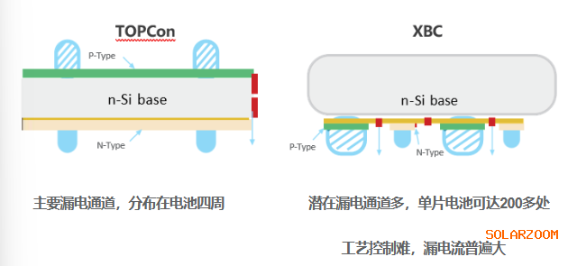 其次,组件在弱光条件下的性能差异源于其底层技术原理。分析表明,光伏电池的弱光性能主要取决于并联电阻、填充因子以及漏电流引起 的复合损耗。BC电池中存在的较多漏电流路径及其填充因子的劣势,导致其在弱光条件下的发电表现(尤其是发电量)相对较差。