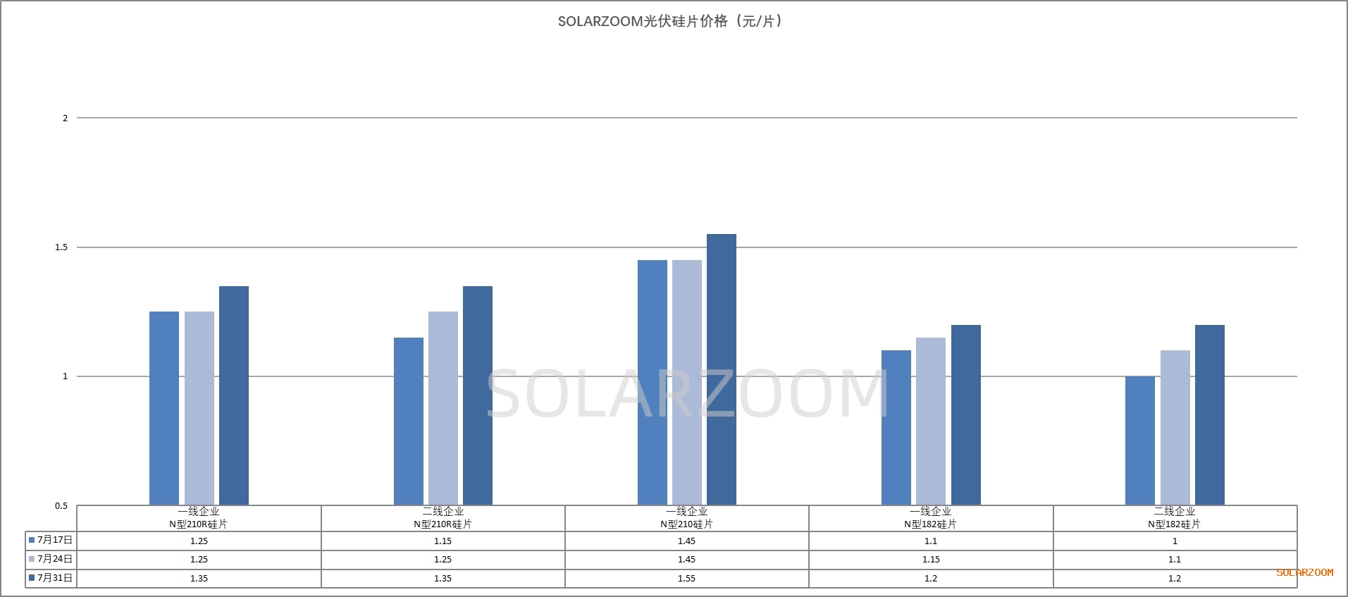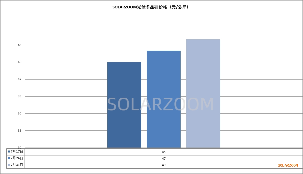 本周国内市场现货硅料的报价仍继续走高,但本周上涨幅度相比前期略有收窄,本周市场N型用料高位报价出现50元/公斤的价格,其他硅料厂商报价仍在46-49元/公斤区间,颗粒硅报价在43-45元/公斤区间。实际成交方面,近期上游价格的上涨向下游的传导较为顺畅,下游对硅料涨价的接受度有所提升,市场上也陆续有少量新订单成交,新单多为与前期所签低价订单搭配签订,搭配后硅料成交价格来至40-43元/公斤;而其他规模化成交订单仍鲜少,前期硅料备货充足的下游企业尚在继续观望中。当前硅料持续上涨的预期带动下,硅料企业多在生产发货中,硅料库存下移至下游环节明显。市场供给方面,当前硅料企业排产变化不大,8月来临,有个别厂商计划检修减产或停产,但大厂新产能释放预期增强,预期8月市场整体硅料产出将环比增长。