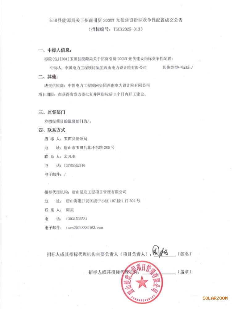 8月1日,玉田县能源局发布《关于招商引资200MW光伏建设指标竞争性配置成交公告》,中国能建旗下中国电力工程顾问集团西南电力设计院有限公司中标。