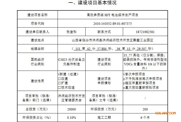 8月5日,临汾市洪洞县人民政府网发布了洪洞经济技术开发区行政审批服务部2025年8月5日建设项目环境影响评价文件受理情况的公示。文件显示,山西立方新能源有限公司高效异质结HJT电池组件生产项目获得环评通过并公示。