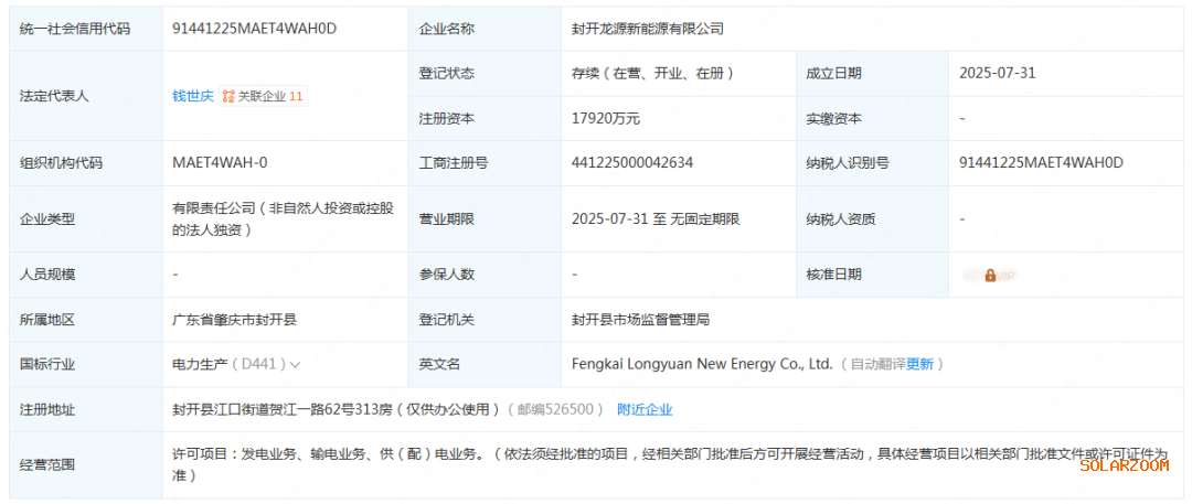 记者获悉,企查查显示,7月31日,封开龙源新能源有限公司成立,注册资本17920万元,法定代表人钱世庆。注册地位于广东肇庆封开县。该公司经营范围为:发电业务、输电业务、供(配)电业务。