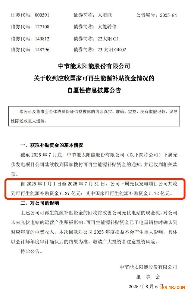 8月6日,中节能太阳能发布公告,披露了公司及其下属光伏电站在2025年前七个月收到可再生能源补贴资金情况。