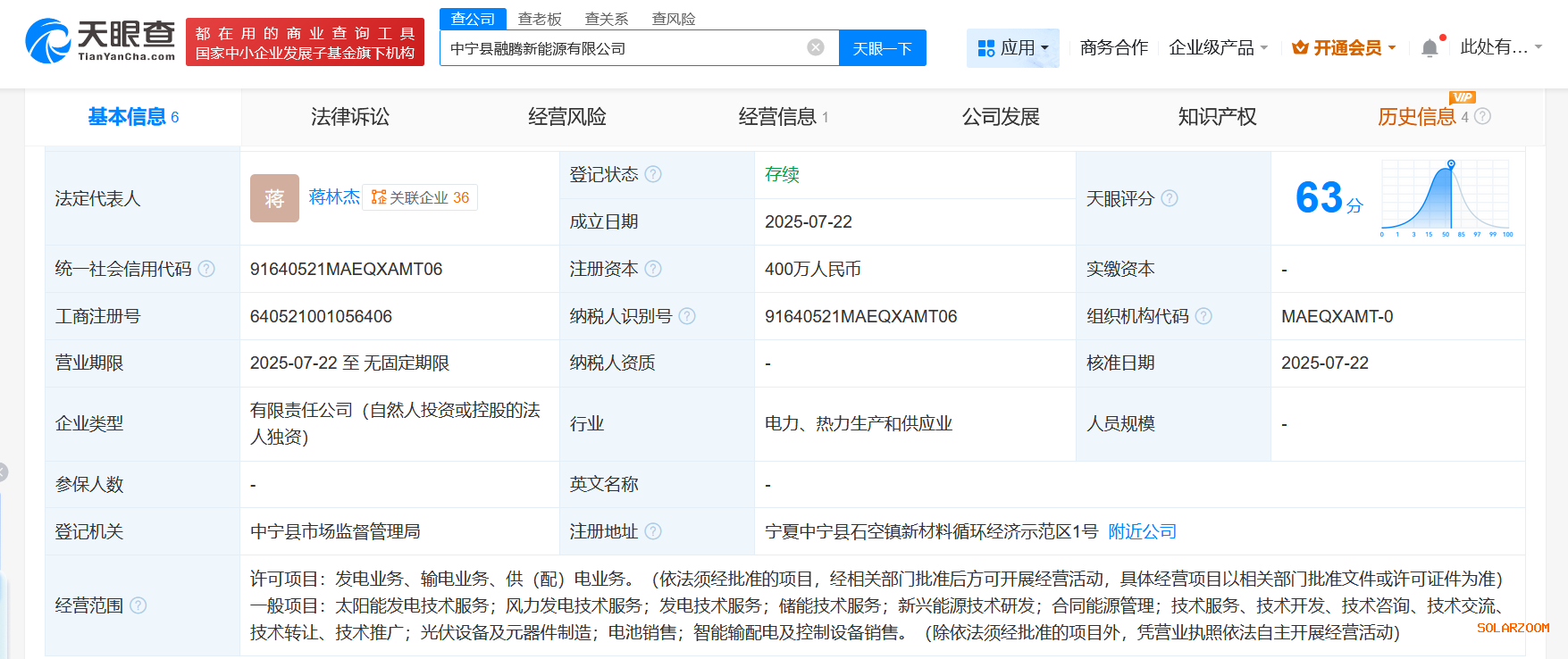 天眼查工商信息显示,近日,中宁县融腾新能源有限公司成立,法定代表人为蒋林杰,注册资本400万人民币,经营范围含发电业务、输电业务、供(配)电业务,太阳能发电技术服务,风力发电技术服务,发电技术服务,储能技术服务等。股东信息显示,该公司由吉利旗下吉利融和(宁波)新能源有限公司全资持股。