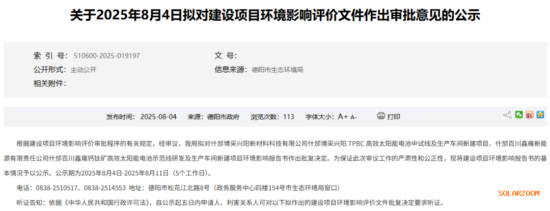 8月4日,四川德阳市生态环境局发布关于什邡博采兴阳 TPBC 高效太阳能电池中试线及生产车间新建项目和什邡百川鑫雍钙钛矿高效太阳能电池示范线研发及生产车间新建项目的环评审批公示。