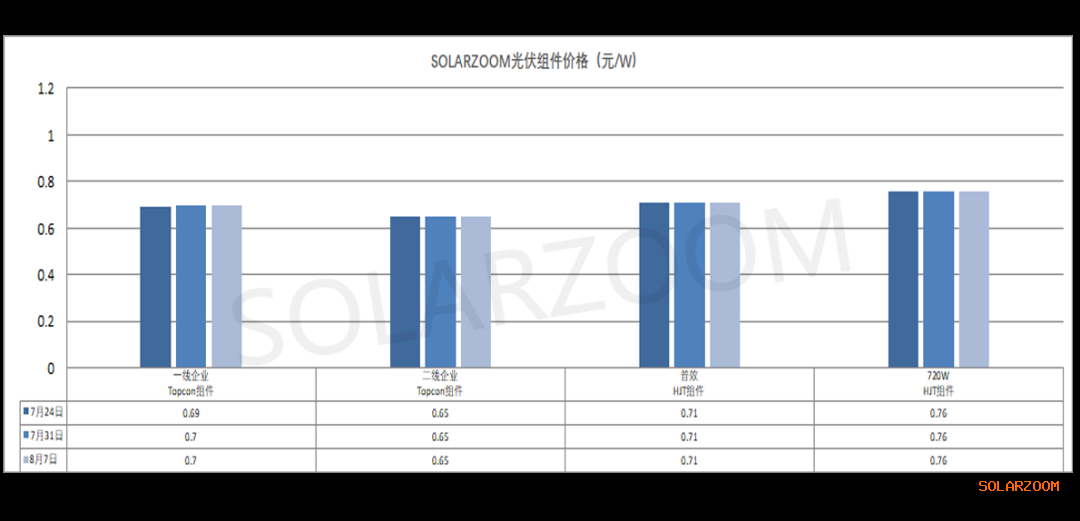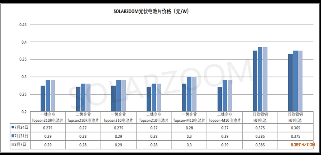 供给上随着近期电池需求的提升以及电池价格的回暖,8月国内电池排产略有提升,预计产量环比增加2-3GW左右。HJT电池方面,当前国内HJT电池产线排产整体不高,而有海外出口需求的企业排产略有提升;价格方面,面对下游现有的HJT电池需求以及HJT电池成本下,HJT电池在产企业坚挺价格意愿明显,当前HJT电池国内价格为0.36-0.38元/W区间,出口海外的急单价格有一定溢价。