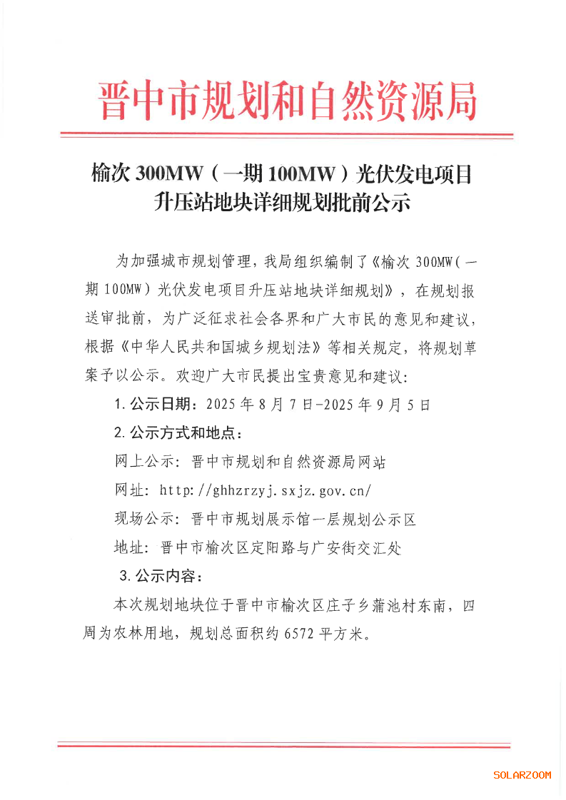 山西榆次300MW(一期100MW)光伏发电项目详细规划批前公示