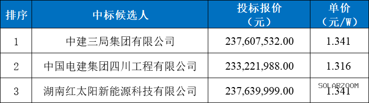 表:重庆云阳汤溪130MW光伏项目光伏区PC总承包工程中标候选人