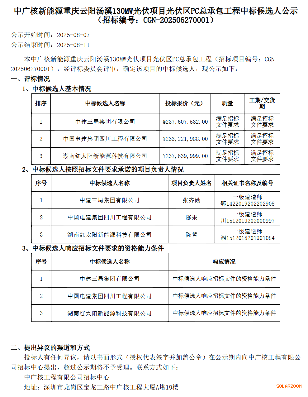 8月7日,中广核新能源重庆云阳汤溪130MW光伏项目光伏区PC总承包工程公布中标候选人,招标人为重庆广云新能源有限公司。项目总体规划容量为130MW,直流装机容量约为177.177MWp。