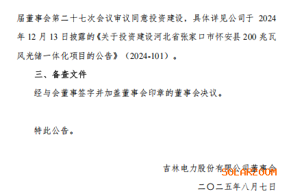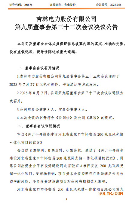8月7日,吉电股份发布公告称,公司审议通过了《关于不再投资建设河北省张家口市怀安县200兆瓦风光储一体化项目的议案》。公司表示,受市场影响,该项目资本金收益率存在无法满足公司收益率的风险,放弃对于河北省张家口市怀安县200兆瓦风光储一体化项目的投资计划。