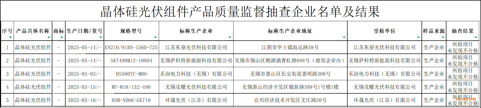 2025年度,无锡市市场监督管理局对晶体硅光伏组件产品质量进行了监督抽查。共抽查产品5批次,未发现不合格。