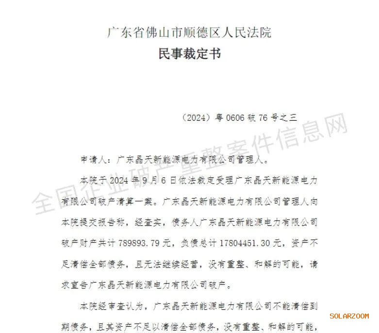 裁定书表明,2024年9月6日,顺德区人民法院裁定受理广东晶天新能源电力有限公司(简称“晶天电力”)破产清算案。晶天电力管理人报告称,经核实,该公司破产财产仅789893.79元,负债却高达17804451.30元,资产远不足以清偿债务,且无法继续经营,重整与和解均无可能,故请求宣告其破产。