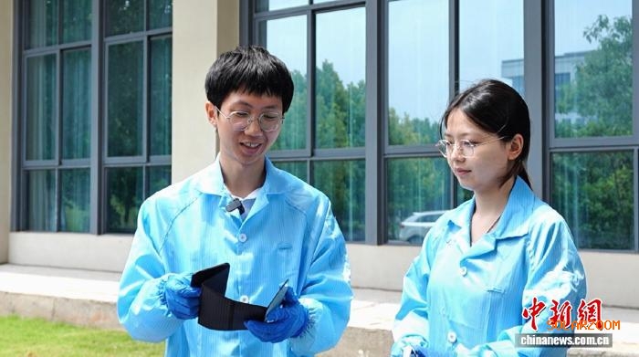 8月13日,团队成员展示柔性钙钛矿太阳能手机壳。尹柳清 摄