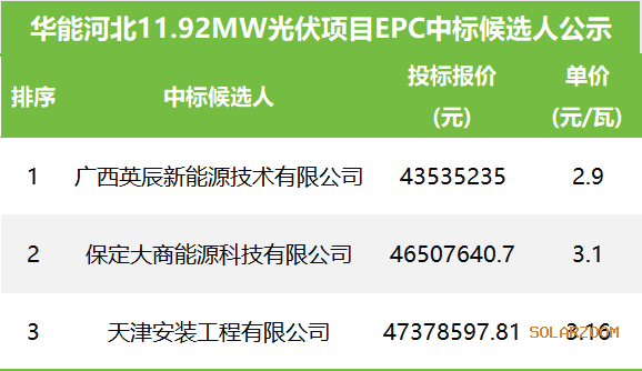 近日记者了解到,8月15日,华能华北分公司华能泰乐芦台东方诚二期11.92MW光伏发电项目EPC工程中标候选人公示,招标人为华能泰乐(唐山)绿色能源有限公司项目直流侧装机容量15012.15kWp,广西英辰新能源技术有限公司以2.9元/瓦位列第一候选人。