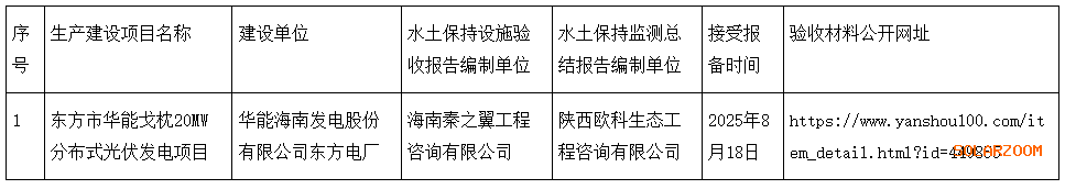 东方市水务局2025年8月份接受的东方市华能戈枕20MW分布式光伏发电项目水土保持设施自主验收报备
